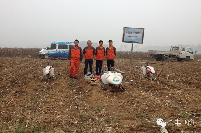 在棉花田里,自走式噴霧機、自走式旋耕機、大型棉花收采機、大型植保拖拉機及全豐航空植保農(nóng)用無人直升機齊上陣,實現(xiàn)對棉花從種到收的全程機械化作業(yè)。植保專家從作業(yè)速度、作業(yè)時間、作業(yè)效果比較分析,農(nóng)用無人機在病蟲害防治方面具有絕 對的優(yōu)勢,同時因遠距離操作,避免了農(nóng)藥對人體的傷害,飛防專用藥劑的高濃度、低容量、簡包裝具備生態(tài)環(huán)保優(yōu)勢。同時,它的出現(xiàn)解決了棉花后期大型機械無法進地作業(yè)或者進地作業(yè)將傷害棉花產(chǎn)量的問題。