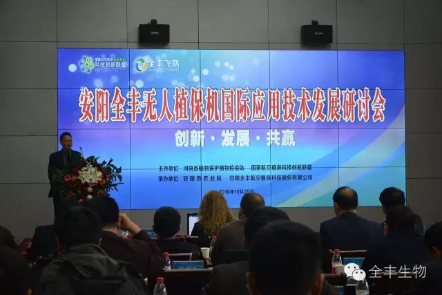 為了促進(jìn)中國無人植保機(jī)與世界接軌,推動航空植保行業(yè)邁上更高的臺階,2016年10月25日,安陽全豐無人植保機(jī)國際應(yīng)用技術(shù)發(fā)展研討會在全豐多功能會議廳成功舉行。